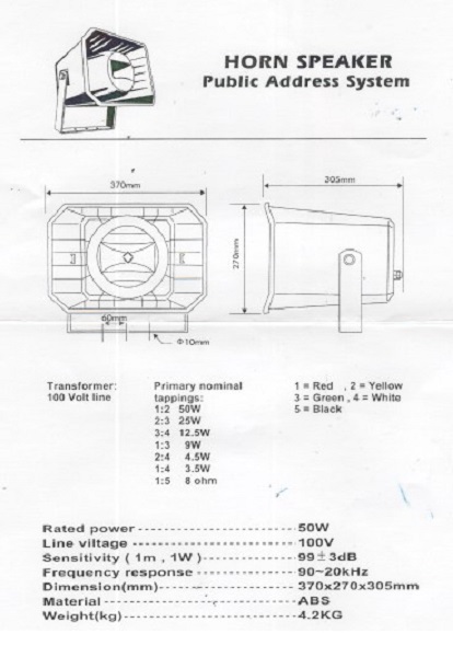 Κορνομεγάφωνο 6,5” 2 δρόμων ισχύος 50 Watts RMS IP-66 (πλαστικό). Μπορεί να λειτουργήσει σε ωμική και εκατοβολτική συνδεσμολογία. Επιλογή ισχύος 50-25-12,5 Watts (100V). Απόκριση συχνότητας 200Hz-20Khz, ευαισθησία 97db (1w/1m)/116db max SPL. Διάσταση χοάνης 370 x 270mm Συμπεριλαμβάνεται μεταλλική βάση τοίχου. Χρώμα λευκό.